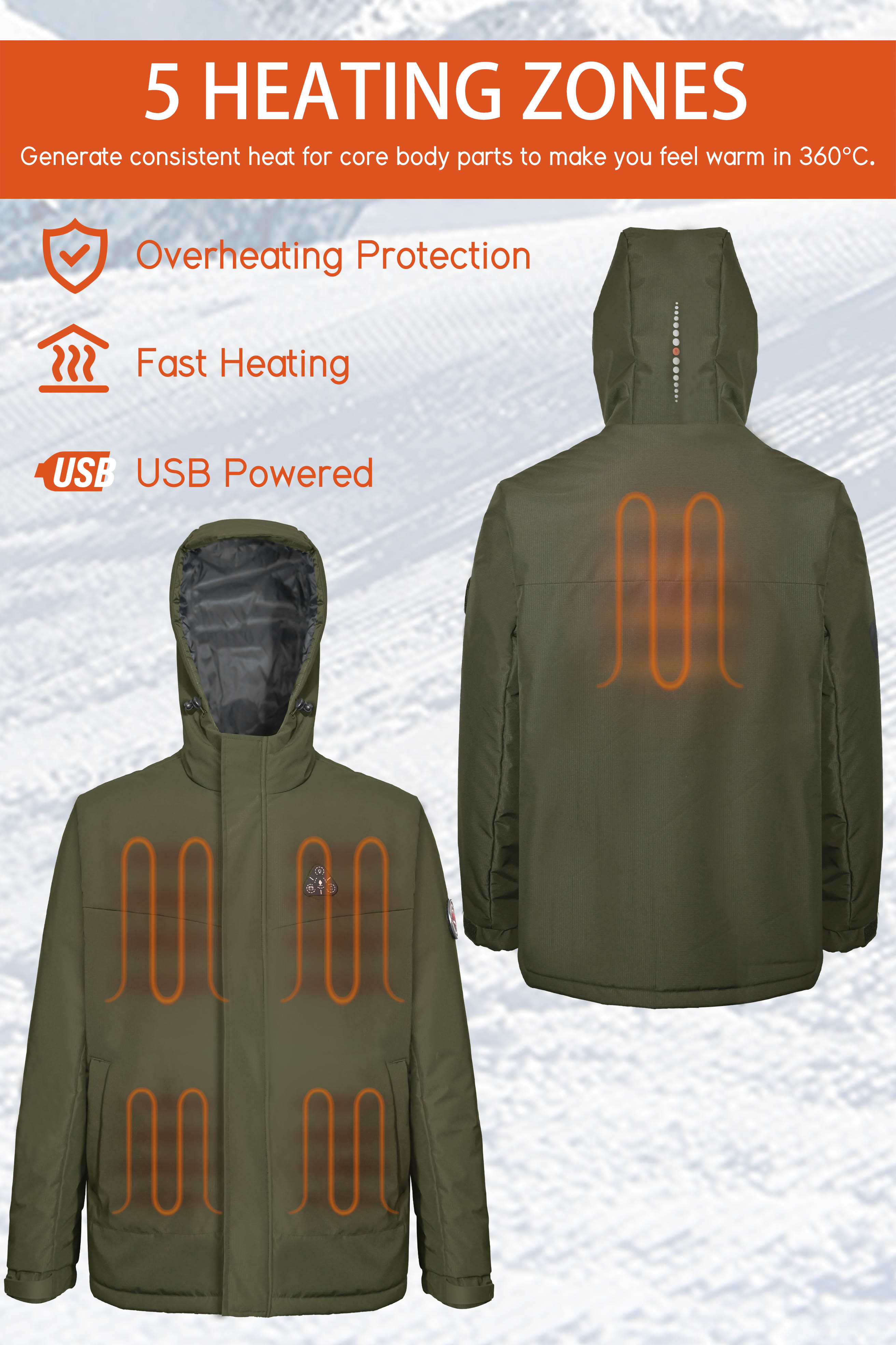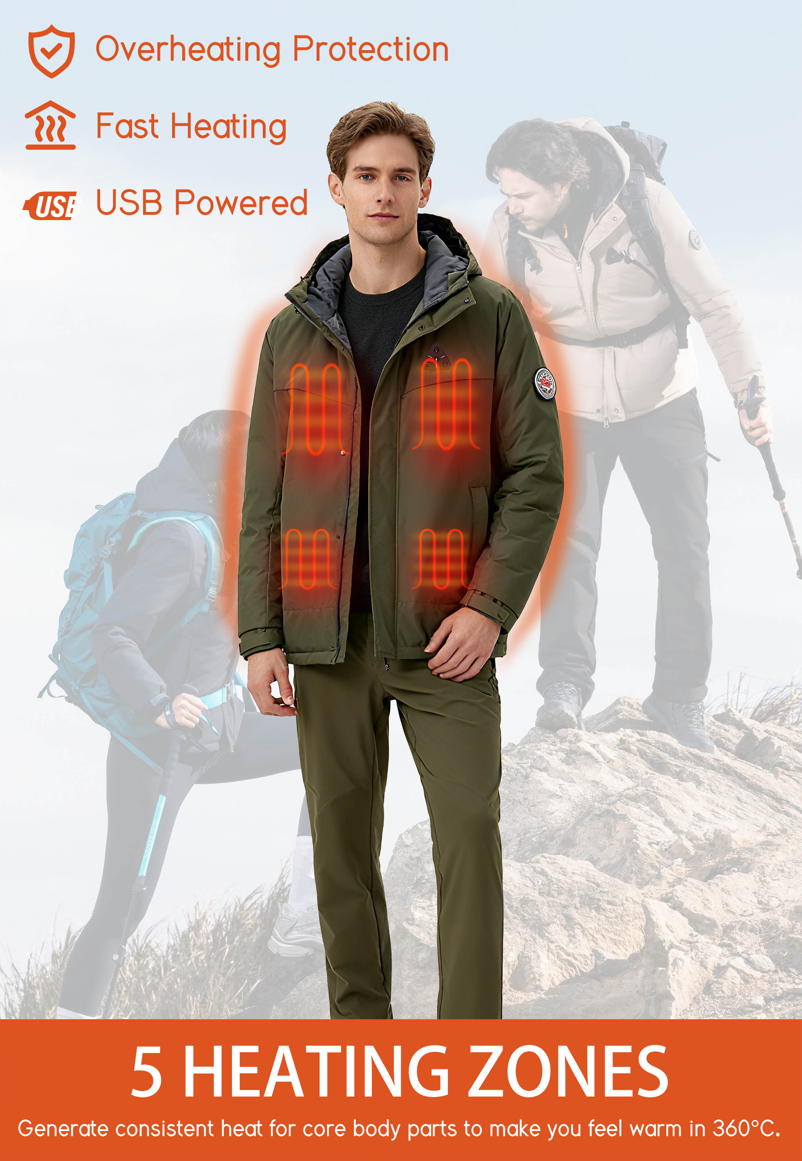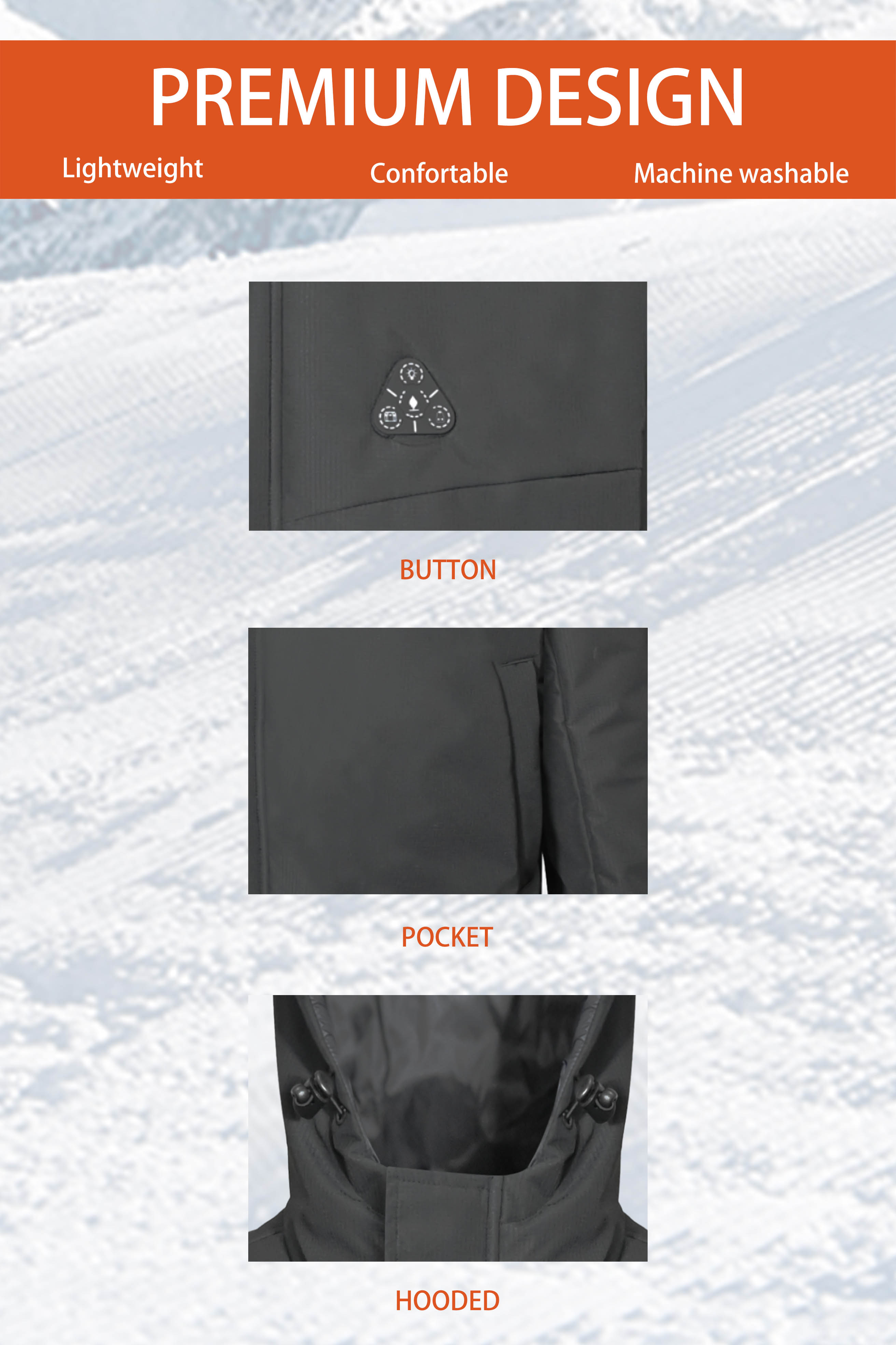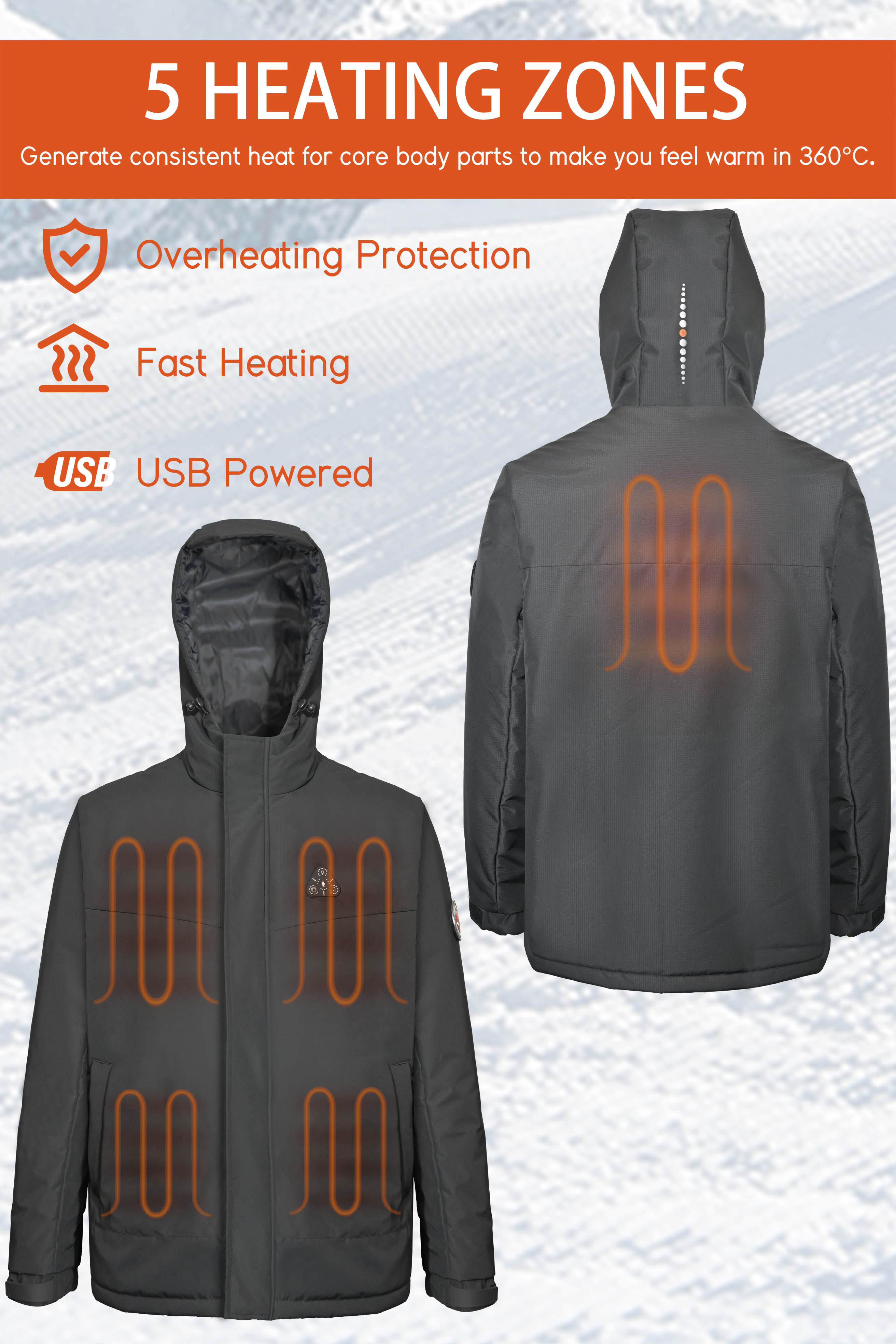 - - Heating elements generate heat across core body areas(left and right chest,pocket,neck and mid-back).