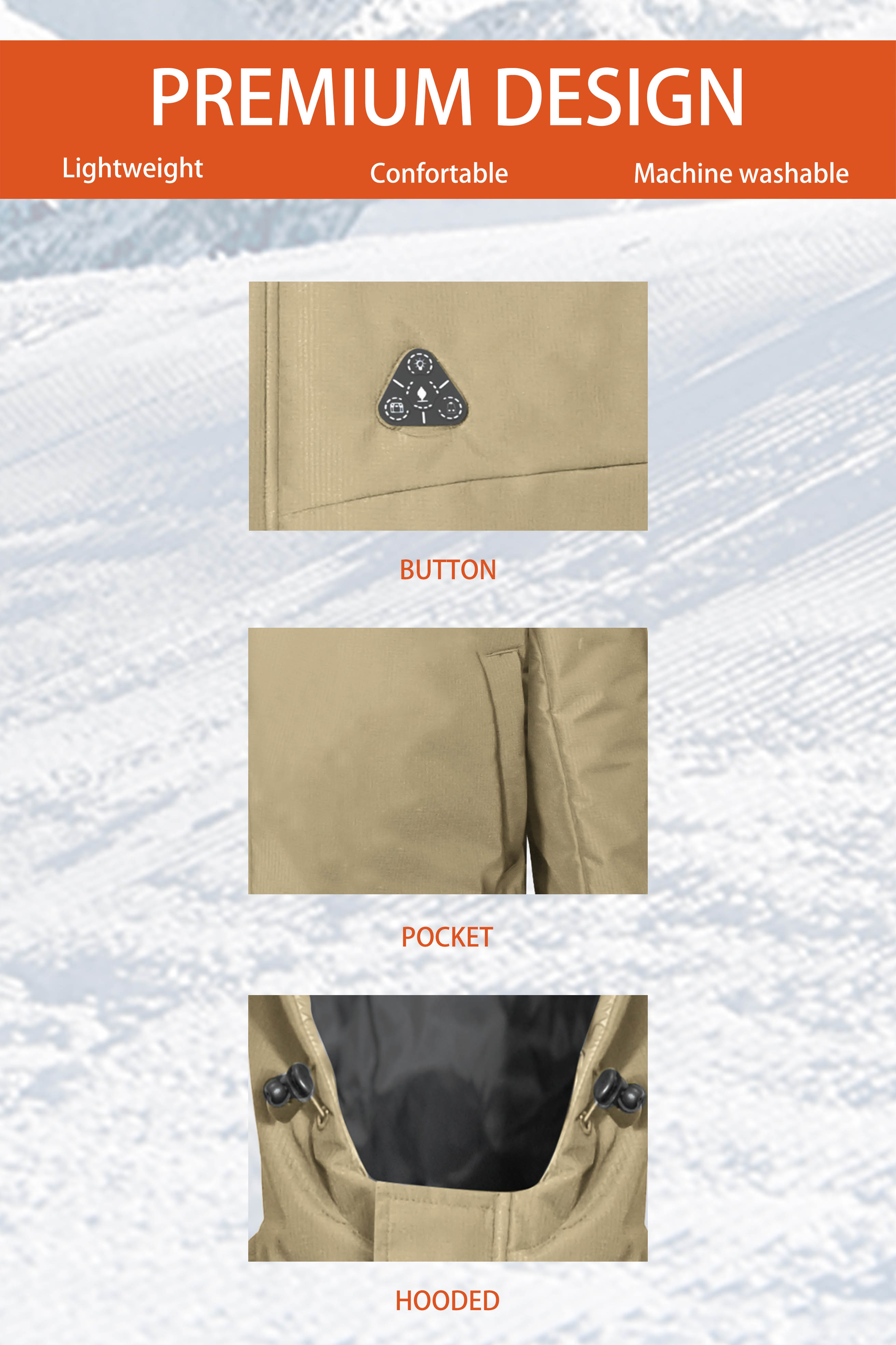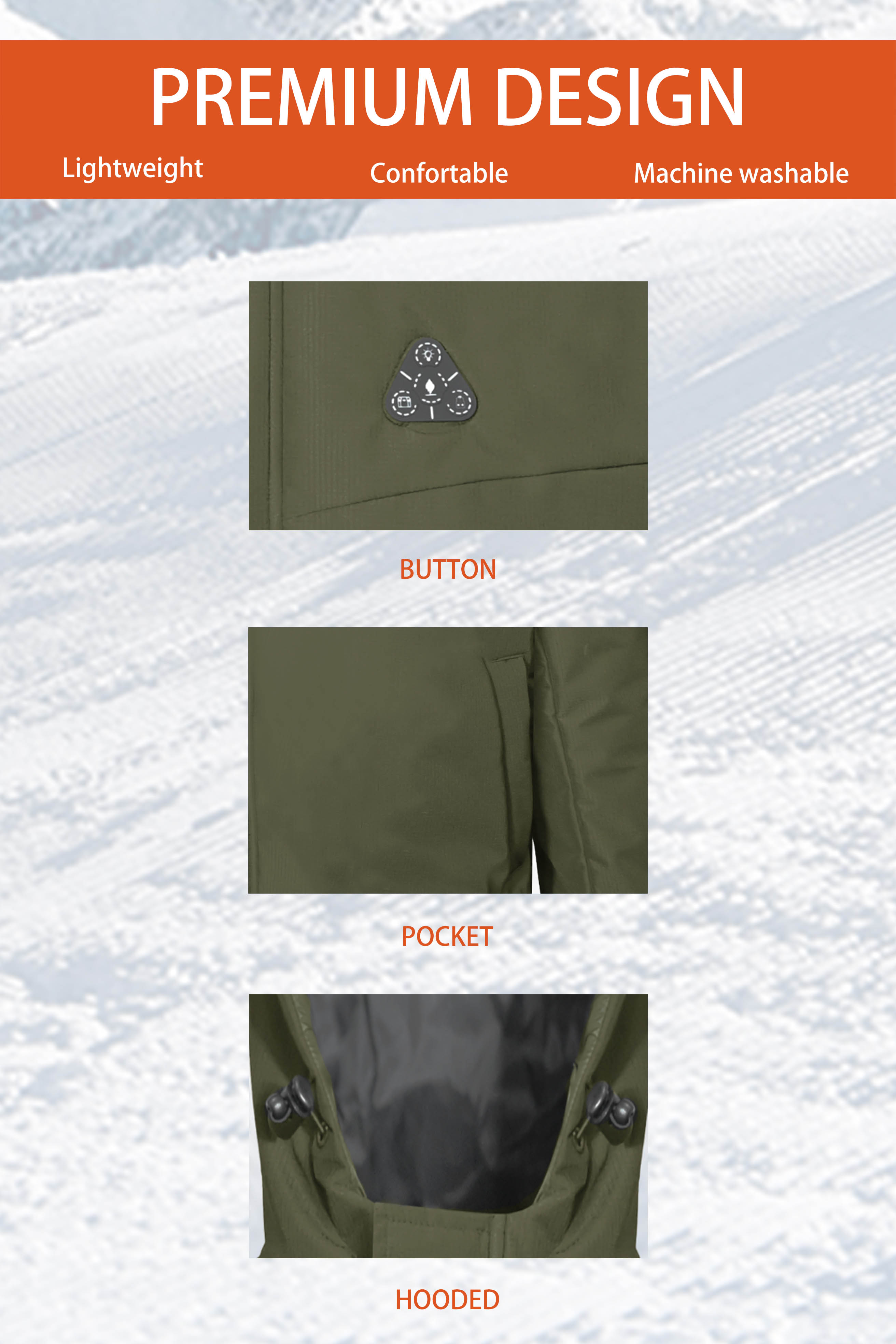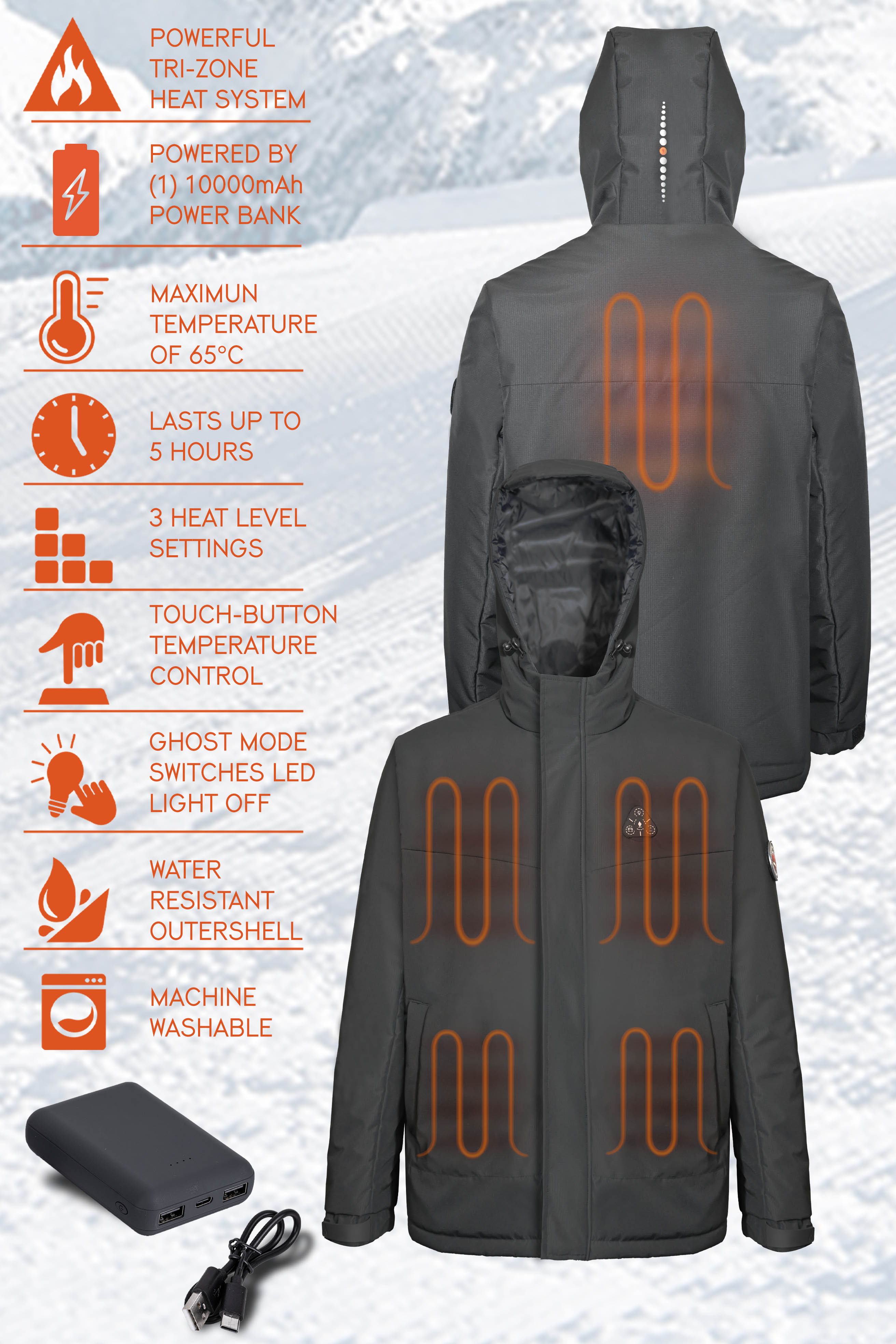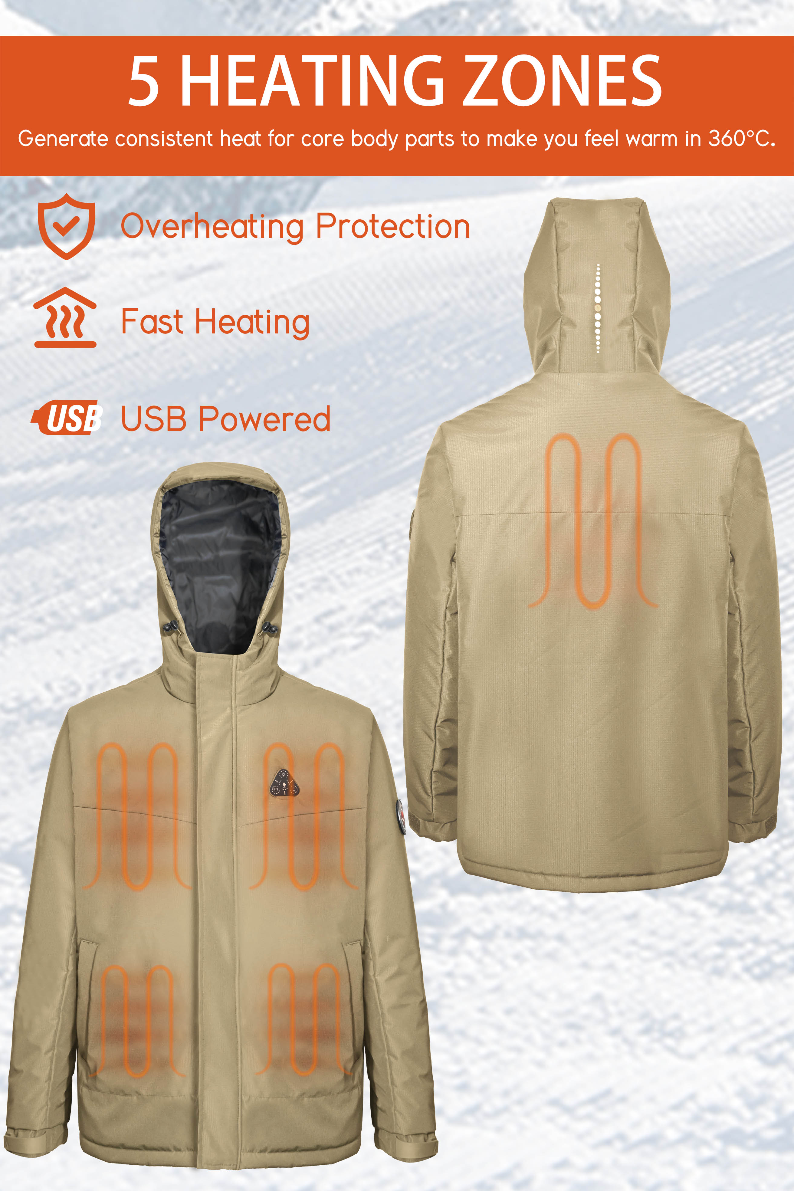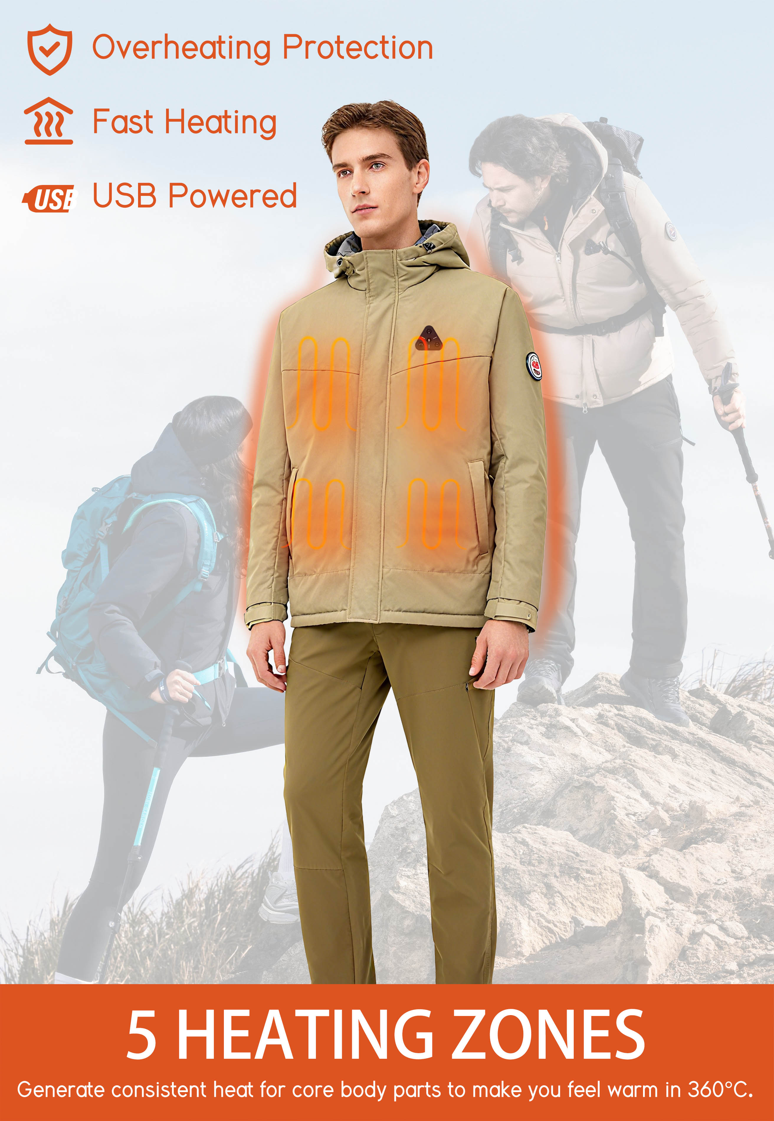 - - Heating elements generate heat across core body areas(left and right chest,pocket,neck and mid-back).