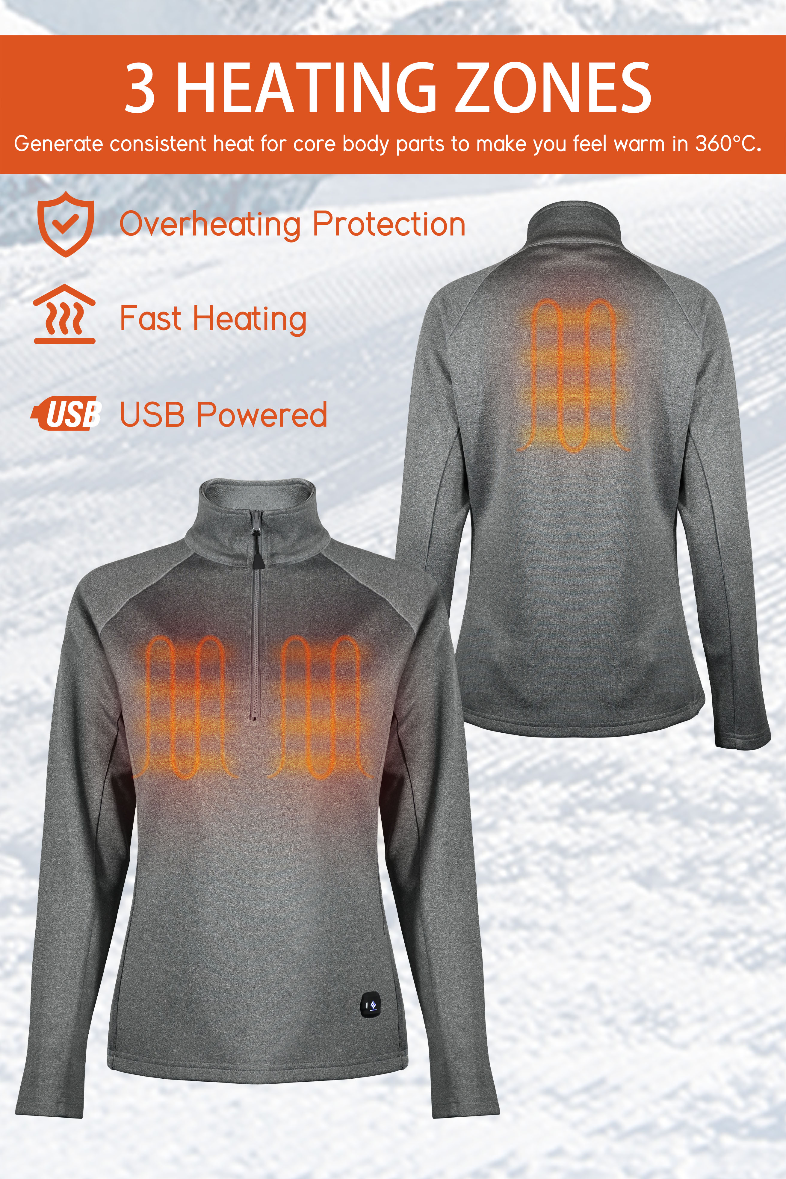 - - Heating elements generate heat across core body areas (left and right chest and mid-back).