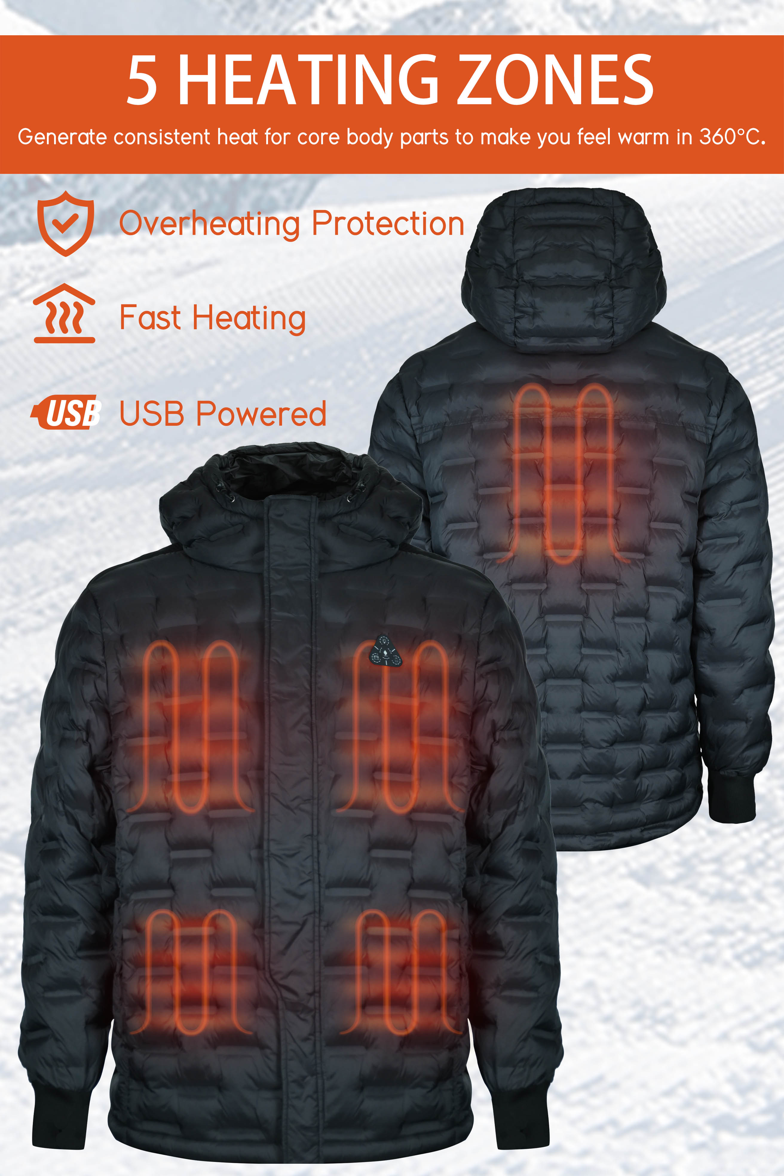 • - The powerful five-zone heating system includes 5 buit-in heating panels, strategically placed on the chest ,