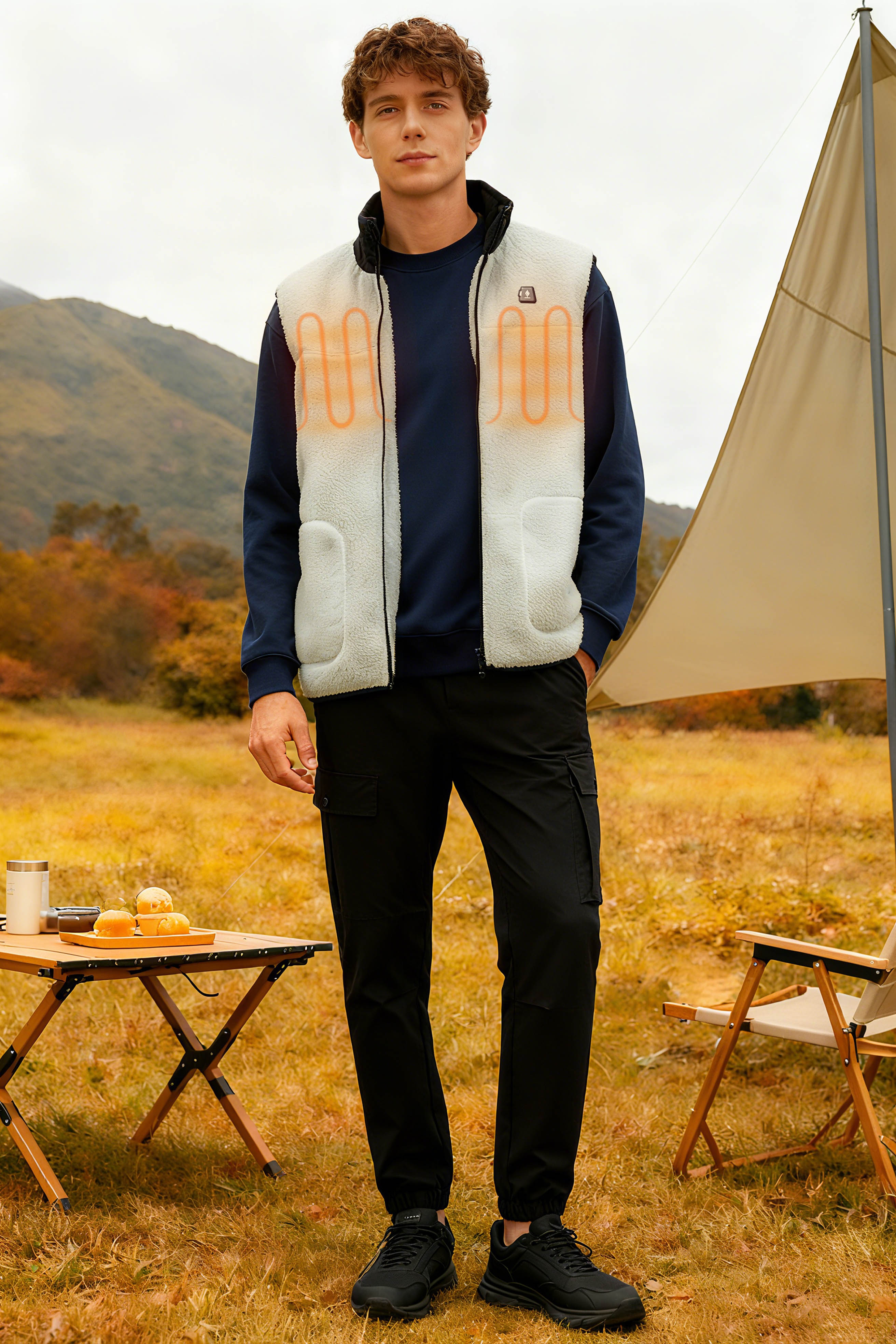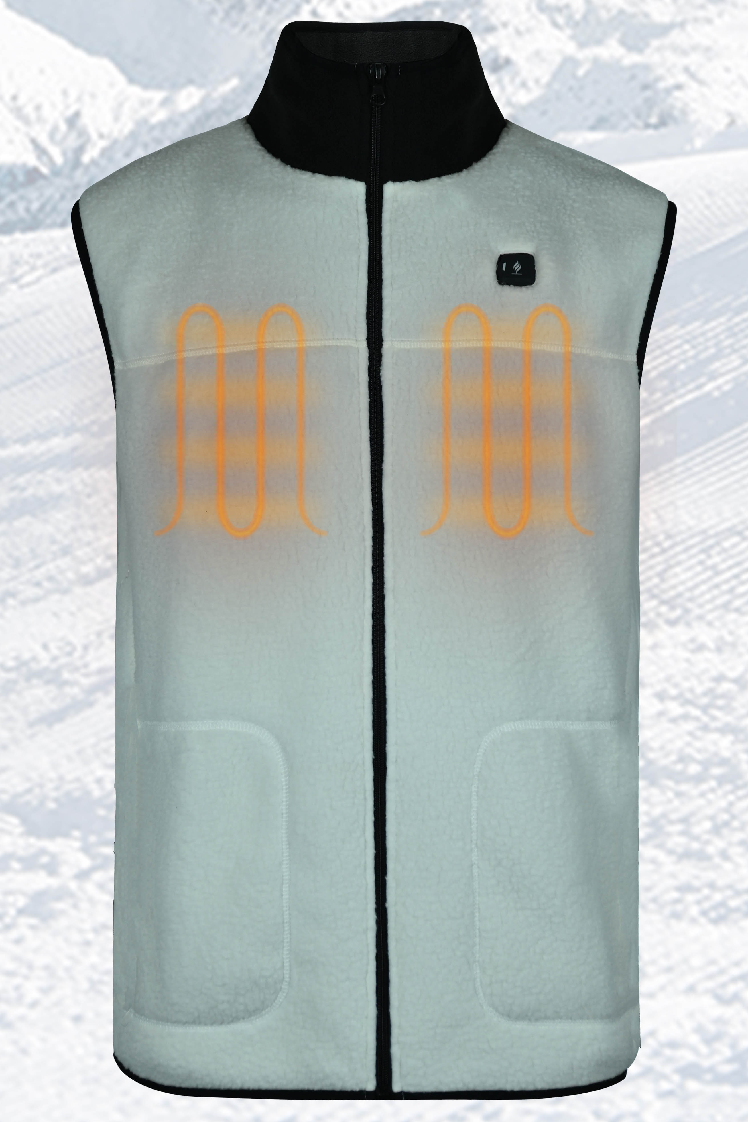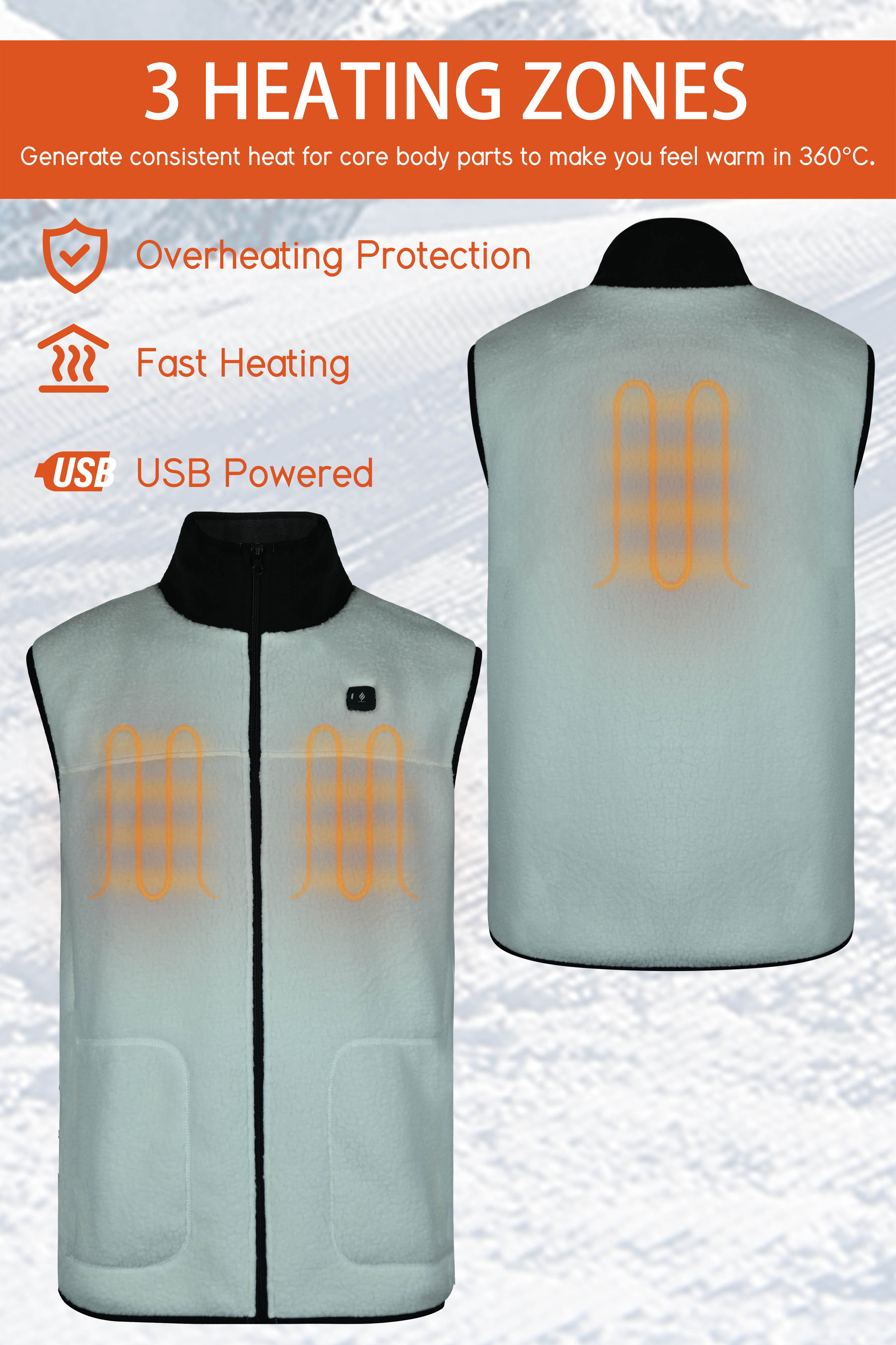 - - Heating elements generate heat across core body areas (left and right chest and mid-back).